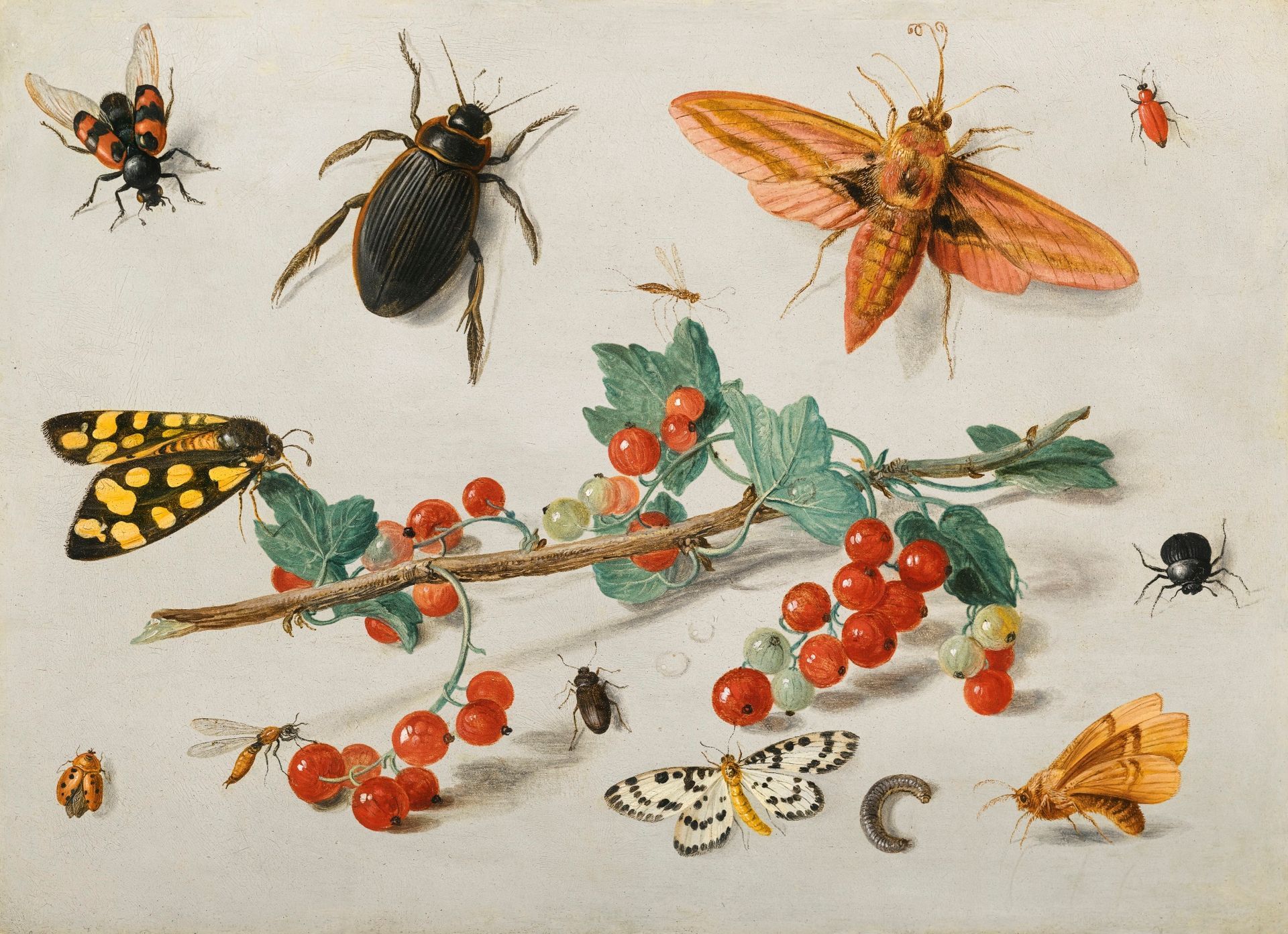 "Griffe de groseilles avec un papillon de nuit, une coccinelle, un mille-pattes et d'autres insectes"